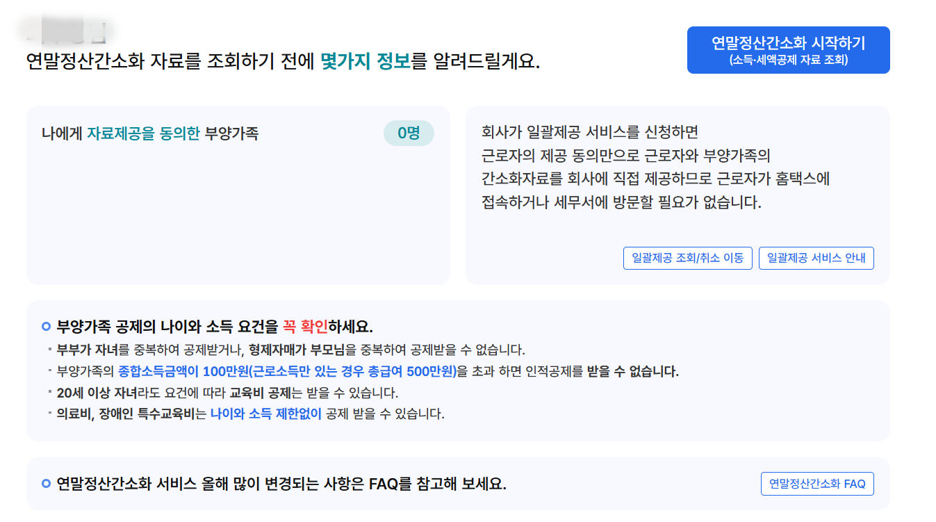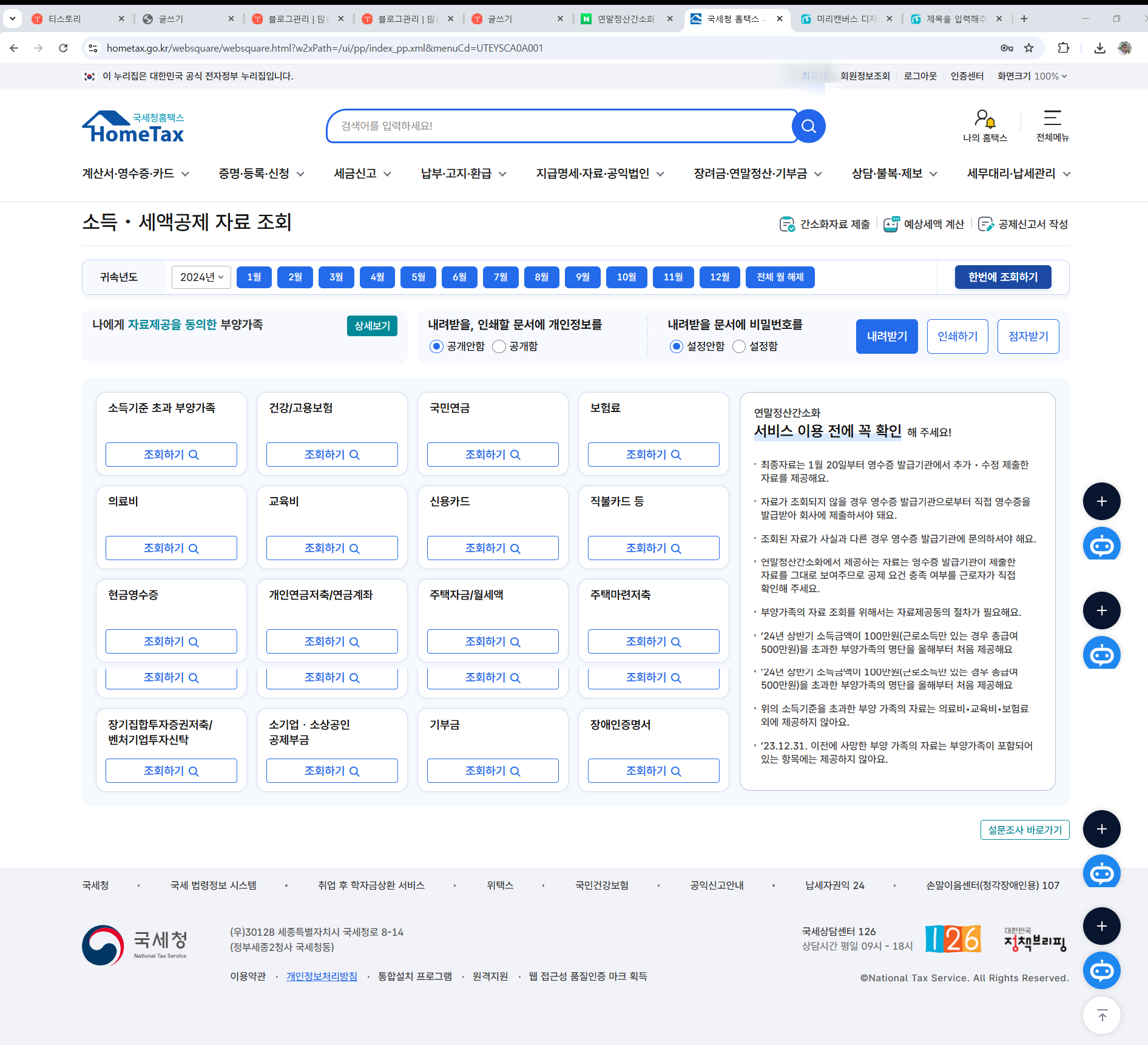 소득기준 초과 부양가족,건강/고용보험, 국민연금, 보험료, 의료비, 교육비, 신용카드, 직불카드 등, 현금영수증, 개인연금저축/연금계좌, 주택자금/월세액, 주택마련저축, 장기집합투자증권저축/벤처기업투자신탁, 소기업·소상공인 공제부금, 기부금, 장애인증명서 등 전반적인 모든 것이 명시되어있어서, 하나하나 누르면서 자세히 알아보시고 꼼꼼히 살펴보신 후에
