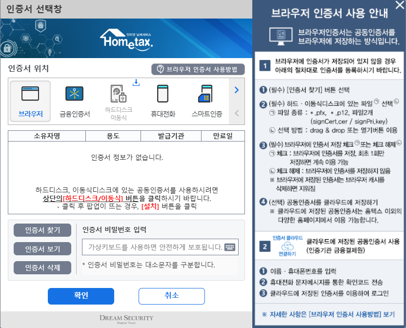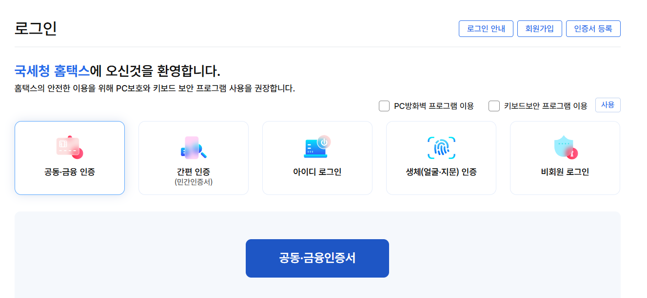 저는 제 pc에 공동·금융인증서 를 깔아놔서 그걸로 인증을 시도해 보았습니다.