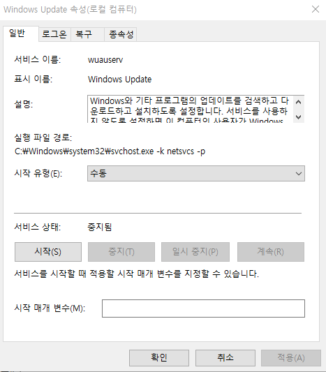 서비스 상태 항목에 '중지' 버튼을 눌러 서비스를 종료하고 시작 유형 항목을