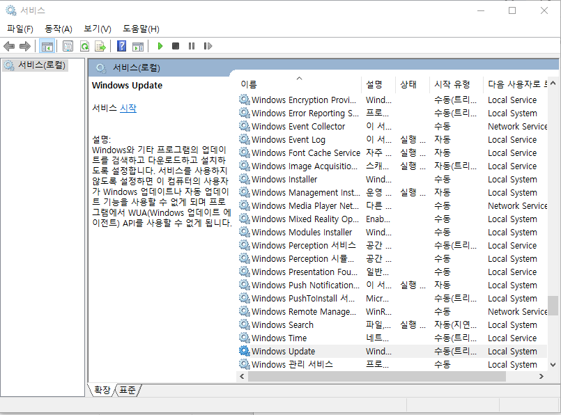 - Windows Update 서비스를 찾아 더블 클릭합니다.
