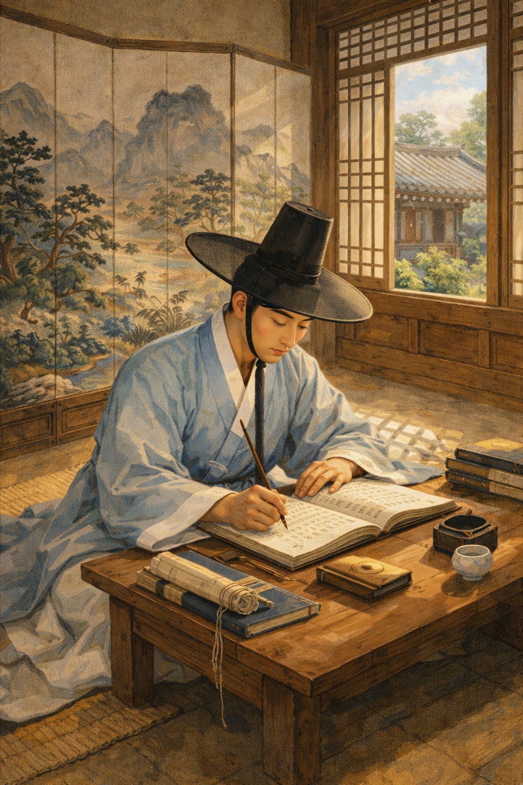 햇빛이 기와지붕을 넘어 시험장 안으로 스며들며, 몽룡의 종이 위를 은은하게 비췄다. 마치 그의 앞날을 비추듯, 밝고 분명한 빛이었다. 그는 잠시 붓을 멈추고 눈을 감았다. 그리고 마음속으로 되뇌었다.